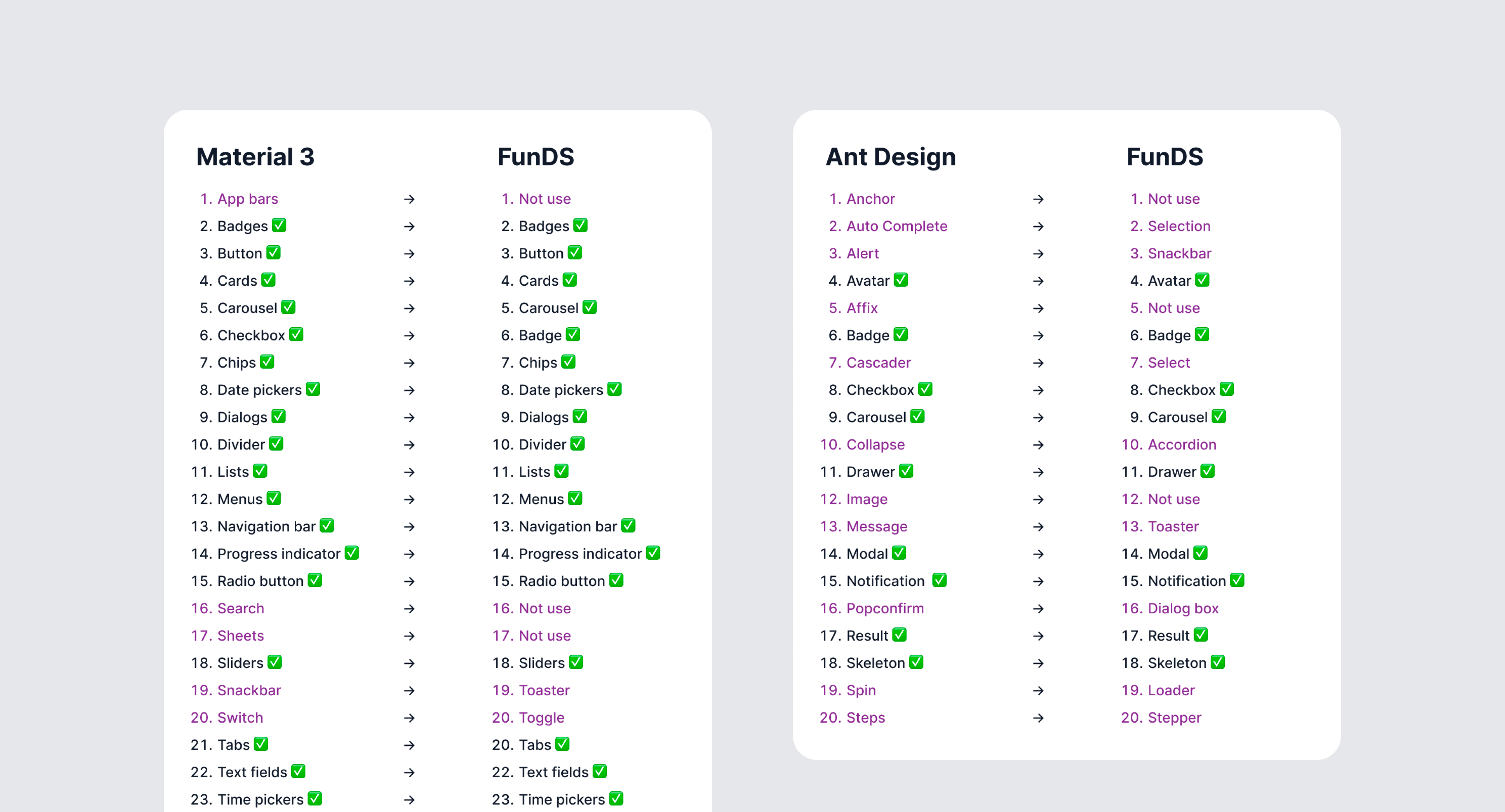 I organized components into the following sections based on their functions — Buttons, Data Input, Data Display, Feedback, and Navigation. The list gets revised continuously and ticked off whenever we finish discussing a component.