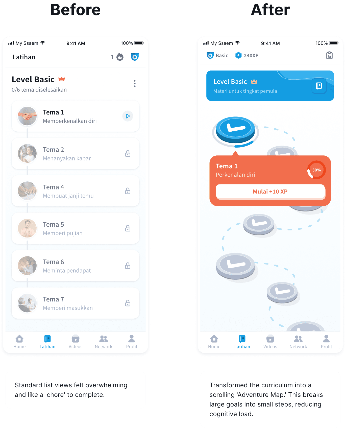 Without a classroom structure, self-learners drop out quickly. We needed retention triggers that felt rewarding, not like homework.