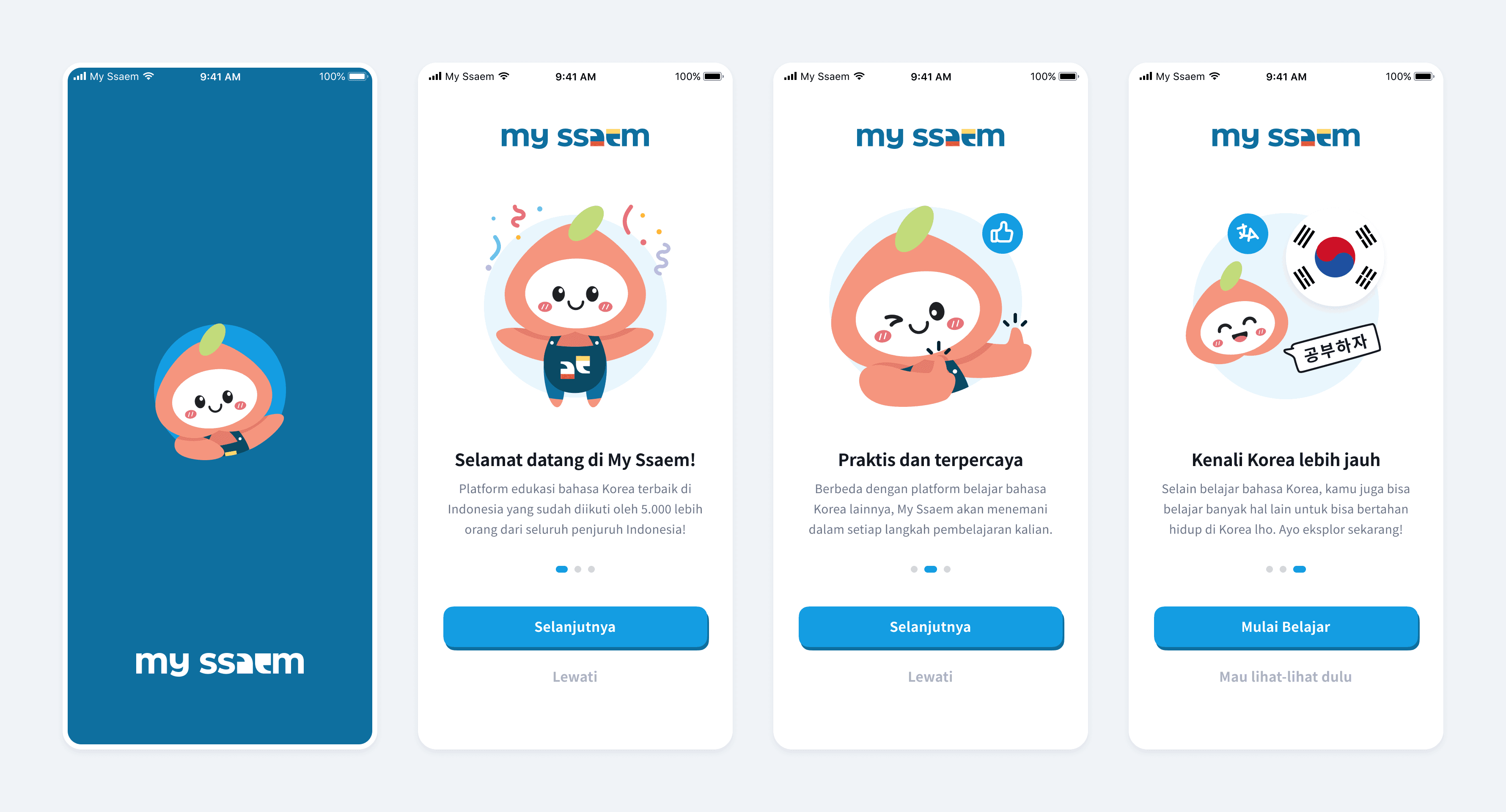 The My Ssaem onboarding flow utilizes a friendly, peach-colored mascot to guide users through a four-stage introduction designed to build brand trust and highlight cultural immersion.
