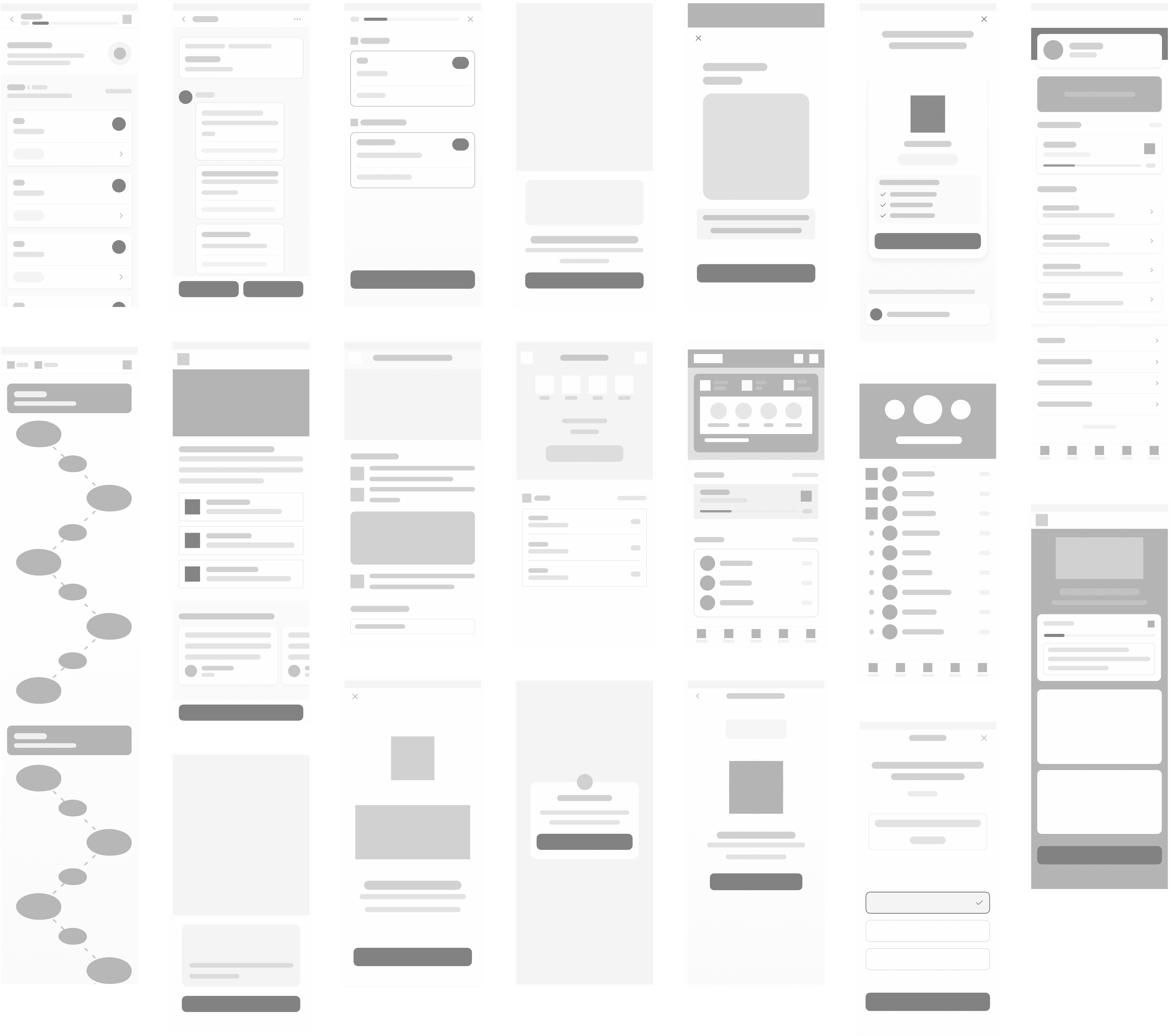 Alongside the information architecture, I sketched my ideas on my iPad, keeping in mind the userโs pain points and motivations. From sketches to mid-fidelity screens, I started by laying out all the pages I needed to design for the three journeys. I blocked out sections for each element and did my detailed work.