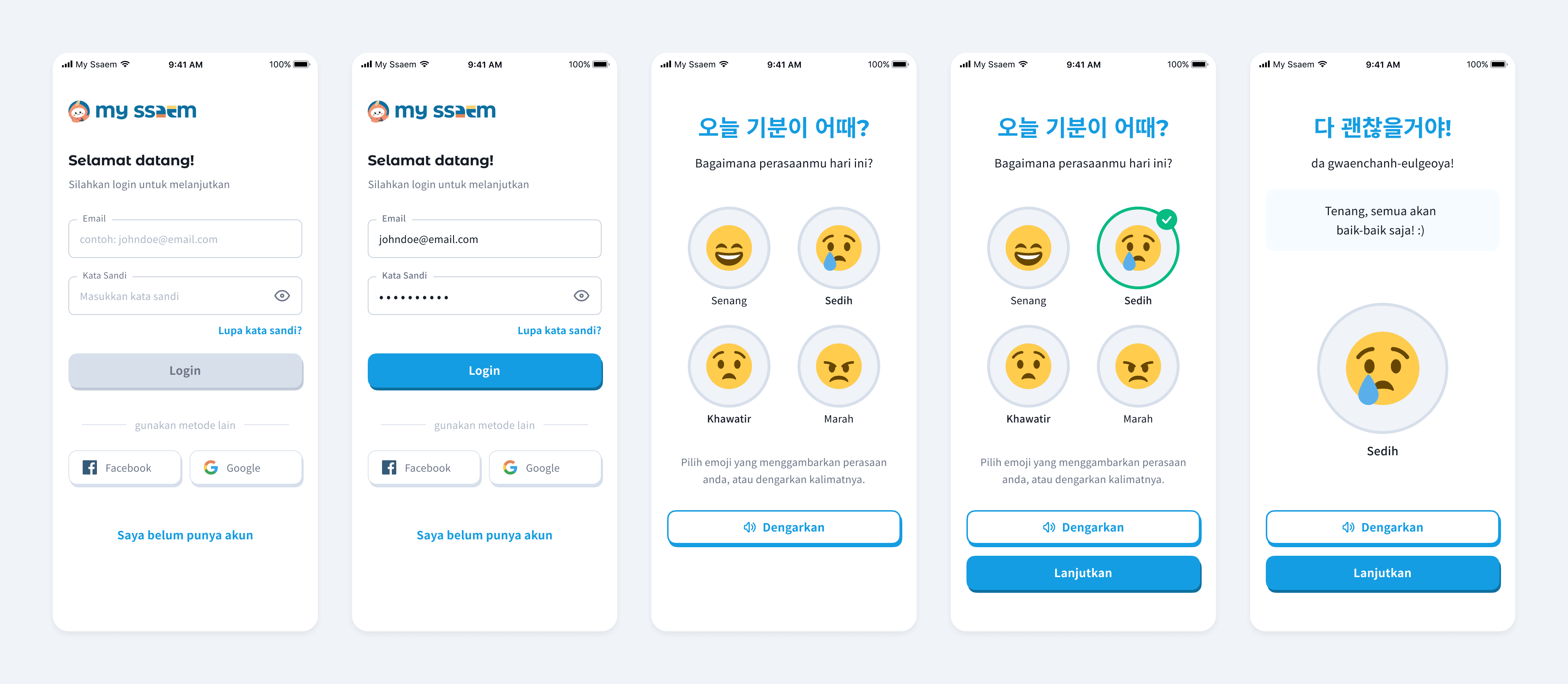 The My Ssaem login screen provides a simple and friendly entry point for users. It supports email and password login, with clear input states, password visibility toggle, and recovery options.