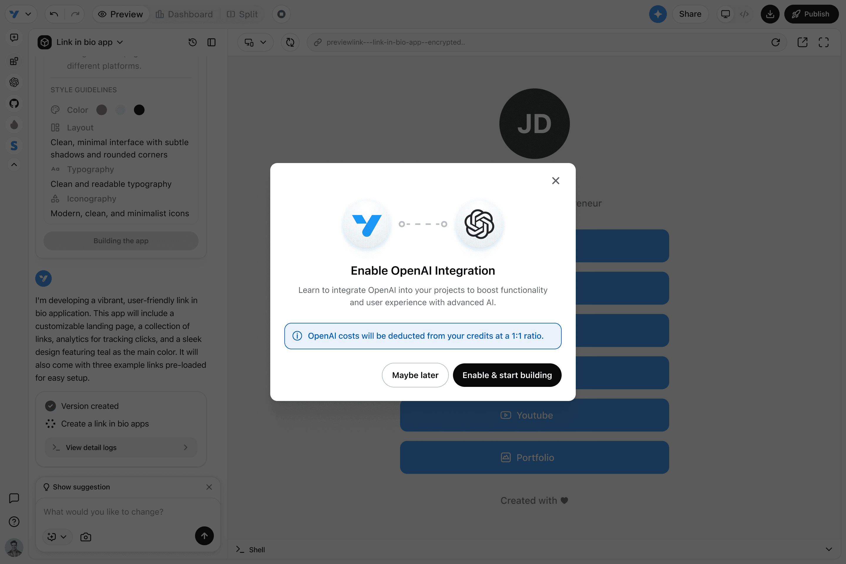 The platform runs using credits, but there was no clear indicator of how many credits remained or how each action consumed them, creating anxiety and unexpected friction mid-build.